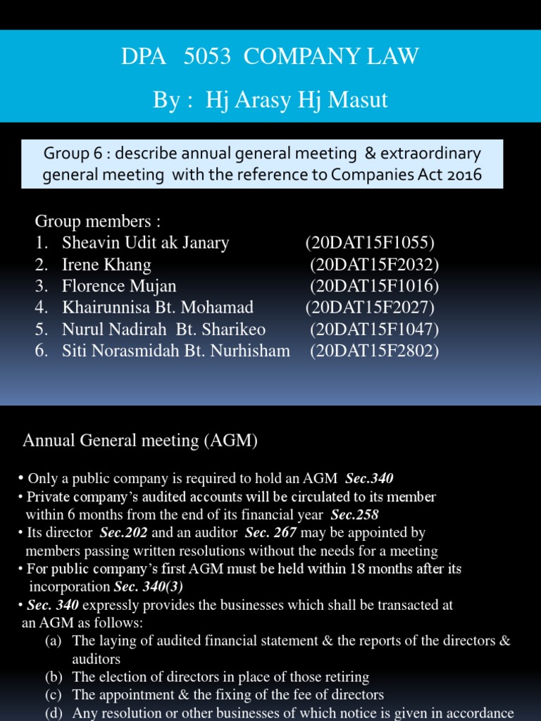 The Malaysian Companies Act 2016 from image.slidesharecdn.com Annual general meetings help members understand the company's rate of growth and potential for improvement. Upon incorporation, a company shall have full capacity to carry on or undertake any business or activity, do any lawful act and do or enter into transactions (section 21 ca 2016). Stipulated time for annual general meeting section 96(1) of the 2013 act the registrar of companies has been empowered by the act itself and he is also bound by the restriction, that the extension can be granted only when there is any persistence of some special reason. The dividend shall be paid to shareholders who on the record date for the dividend payment, 29 march 2016, are recorded in the company's. Prior to joining spicers, he notice of meeting 2012 agm unity mining limited abn 61 005 674 073 notice is given that the 2012 annual general meeting of unity mining limited. The companies act 2016 (ca 2016) repealed the companies act 1965 (ca 1965) and changed the landscape of company law in malaysia. Please state name, personal id, address, telephone no. An annual general meeting (agm, also known as the annual meeting) is a meeting of the general membership of an organization.