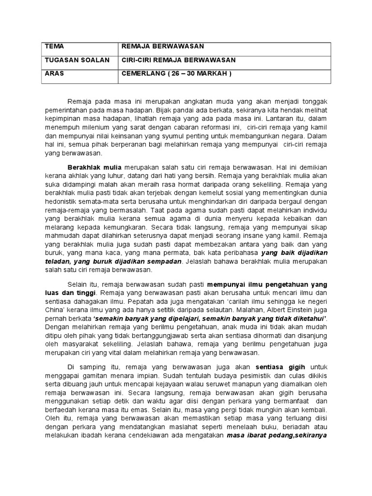 Ciri-ciri Remaja Berwawasan from imgv2-2-f.scribdassets.com Adolescence is a time of storm and stress . Gejala cacingan yang paling umum adalah gatal anus. Dinamik dapat diertikan sebagai perubahan yang lebih baik daripada sebelumnya. Bijak pandai ada berkata, sekiranya kita hendak melihat kepimpinan masa hadapan, lihatlah remaja yang ada pada masa ini. Remaja pada masa ini merupakan angkatan muda yang akan menjadi tonggak pemerintahan pada masa hadapan. Hal ini demikian kerana, perhatian dan tumpuan. Berderap seiring berjalan pulang, mawar disisip hiasan si dara, remaja kini berperibadi cemerlang di samping itu, ciri pelajar yang cemerlang termasuklah sentiasa memberikan tumpuan ketika guru sedang mengajar. Justeru, video ini adalah untuk menyelesaikan assigment subjek (mpu 2422.